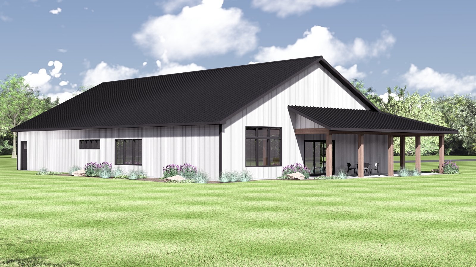 This 2,035 square feet open concept Barndominium house plan, with Modern Farmhouse influences, offers a spacious main bedroom which includes an oversized walk-in closet and a large tiled shower. The sizable attached shop offers abundant space, whether it be for ample parking, projects, or workspace. Two additional bedrooms and a full bath are great for first time home buyers, people looking to downsize, or smaller families. The kitchen offers an 8′ island, large pantry, and views out the front. Large windows and a slider that opens out to the wraparound covered porch offer great side views of the property. House Plans Online is committed to equipping homeowners with detailed and practical plans to help create the perfect home. Each plan is purposefully crafted to balance functionality, efficiency, and charm.